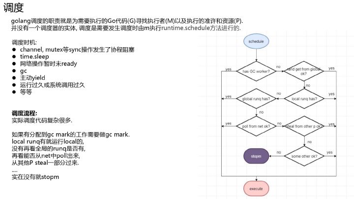 并没有一个一直在运行调度的调度器实体. 当一个协程切换出去或新生成的 m, go 的运行时从 stw 中恢复等情况时, 那么接下来就需要发生调度. go 的调度是通过线程(m)执行 runtime.schedule 函数来完成的.