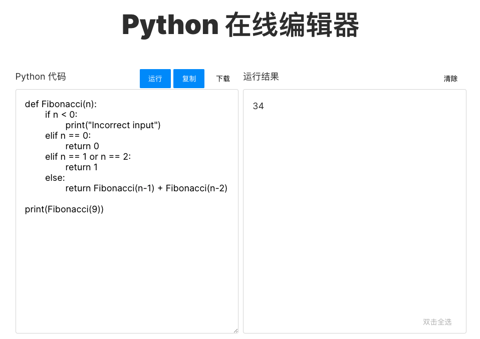 不用PyScript,网页端运行的Python编辑器 原文:https://lwebapp.com/zh/python-online需求有小伙伴可能听说过 PyScript,知道了Python可以通过打包成wasm运行在浏览器端了,这样做一些需要Python来做的功能,可以直接在浏览器完成,无需和服务器交互,打开了开发者的想象力。这里我们要推荐的是一个在线工具,也是支持Python代码的执行,一个在线的Python代码编辑器[外链图片转存失败,源站可能有防盗链机制,建议将图片保存下来直接上传(img-QM6VdWX0-1652435053894)(ht