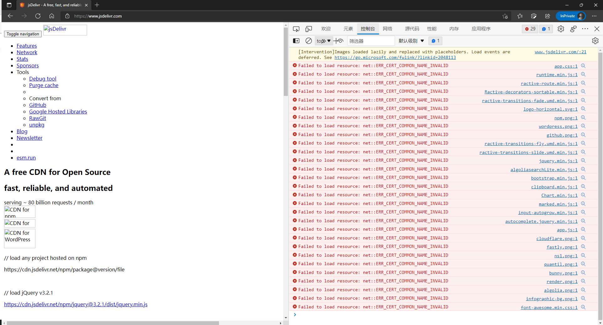 没错,jsdelivr挂了,根据网友反馈,涉及到使用jsdelivr服务的所有网站,都出现了问题