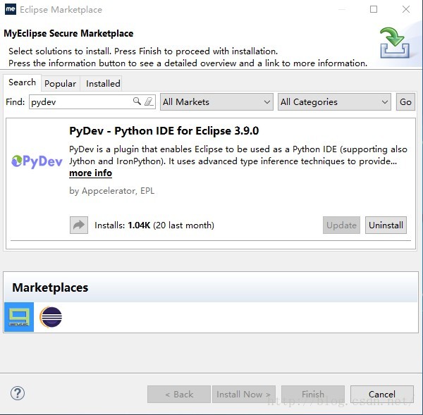 4. 出现如下界面后,输入pydev后搜索,出现如下的列表,点击右下角的install(因为我已经安装过了,所以变成了uninstall)