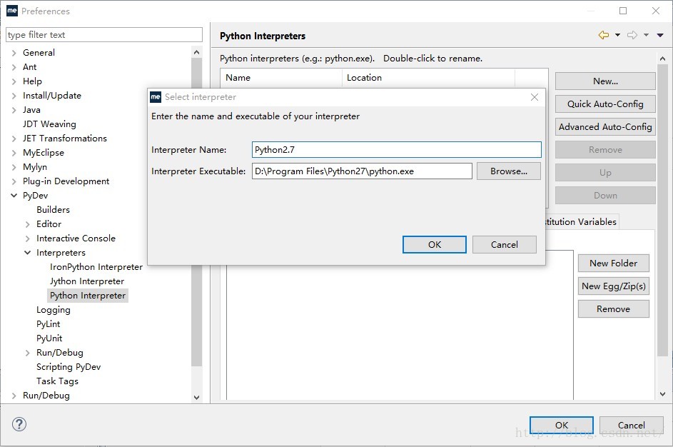8. 添加python解释器,点击Window- >Preferences->PyDev->interpreter Python,出现如下窗口,选择你的python.exe解释器安装路径,一路ok就可以
