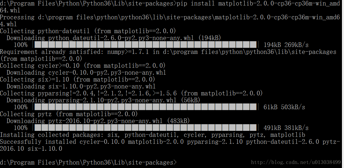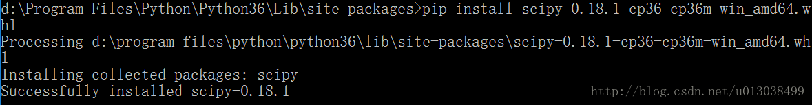 首先下载对应于已安装的python版本的numpy,scipy,matplotlib库文件,提供链接http://www.lfd.uci.edu/~gohlke/pythonlibs/