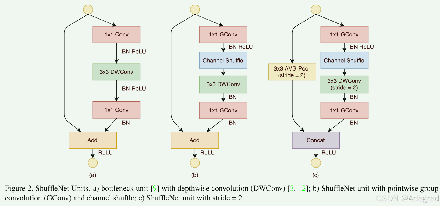 ShuffleNet: An Extremely Efficient Convolutional Neural Network for MobileDevices 我们介绍了一种极具计算效率的CNN架构,名为ShuffleNet,它是专门为计算能力非常有限(例如,10-150 MFLOPs)的移动设备设计的。新架构采用了点群卷积和通道shuffle两种新的运算,在保持精度的同时大大降低了计算成本。在ImageNet分类和MS COCO目标检测上的实验表明,在40 MFLOPs的计算预算下,shufflenet在ImageNet分类任务上的top-1误差比最近的MobileNet[12]低7.8%,优于其他结构。