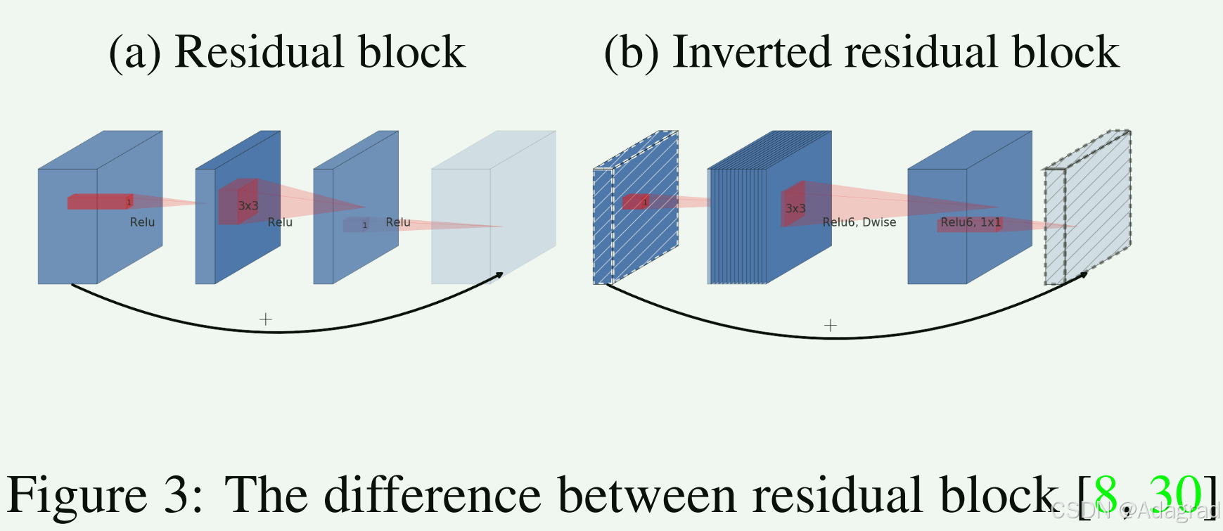 MobileNetV2: Inverted Residuals and Linear Bottlenecks 在本文中,我们描述了一种新的移动架构 MobileNetV2,它提高了移动模型在多个任务和基准测试以及各种不同模型大小上的最先进性能。我们还描述了在我们称为 SSDLite 的新颖框架中将这些移动模型应用于对象检测的有效方法。此外,我们还演示了如何通过 DeepLabv3 的简化形式(我们称之为 Mobile DeepLabv3)构建移动语义分割模型。基于反向残差结构,其中快捷连接位于薄瓶颈层之间。中间扩展层使用轻量级深度卷积来过滤作为非线性源的特征。