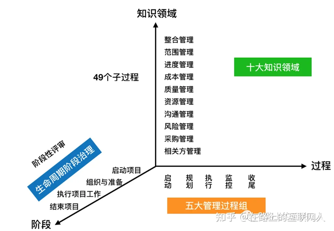 PMI将项目管理分为了五大过程组和十大知识领域,共49个子过程,如下图: