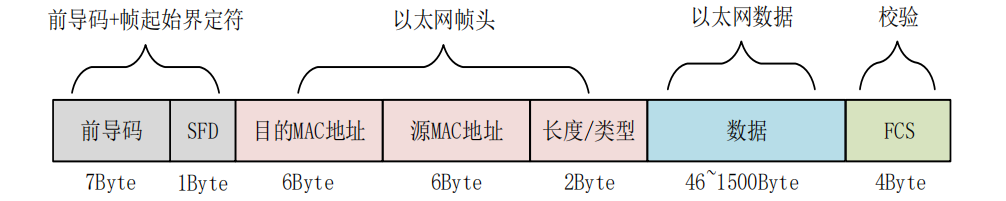 - 4个字节(32位),采用循环冗余校验(CRC)算法计算得出,用于检测帧在传输过程中是否出错。