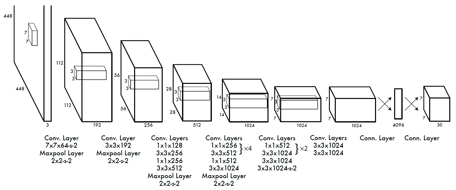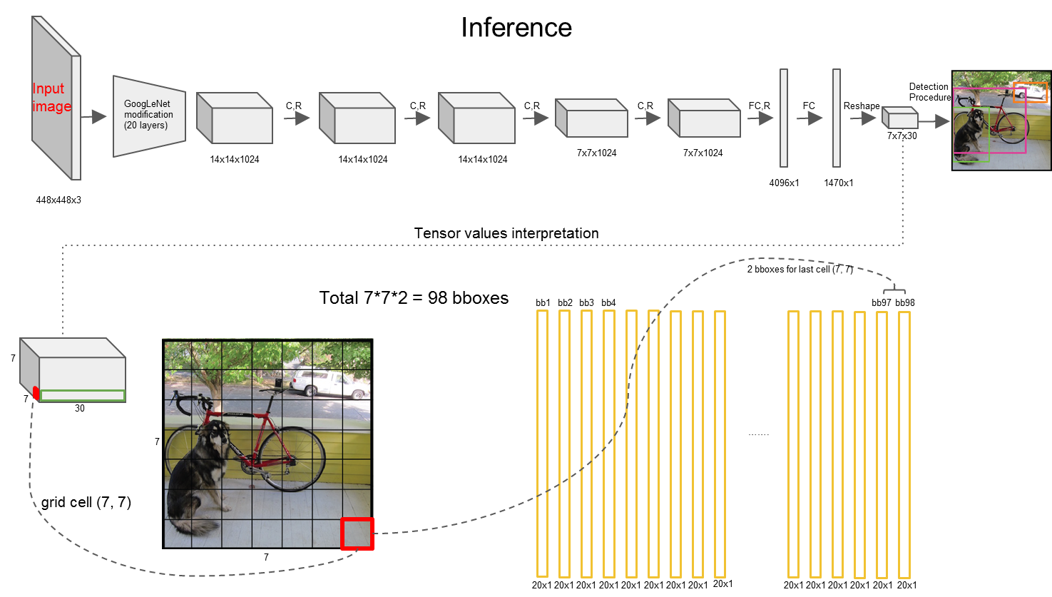 2 YOLO网络借鉴了GoogLeNet分类网络结构。不同的是,YOLO未使用Inception Module,而是使用1*1卷积层(此处1*1卷积层的存在是为了跨通道信息整合)+3*3卷积层简单替代。