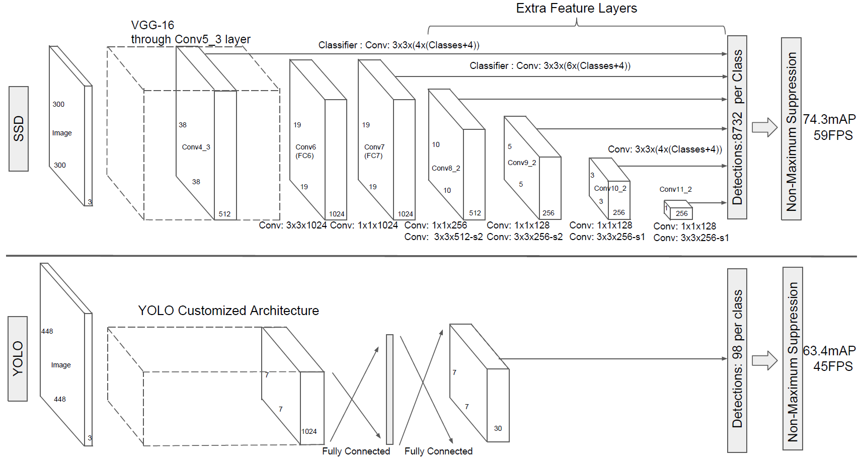3 Fast YOLO使用9个卷积层代替YOLO的24个,网络更轻快,速度从YOLO的45fps提升到155fps,但同时损失了检测准确率。