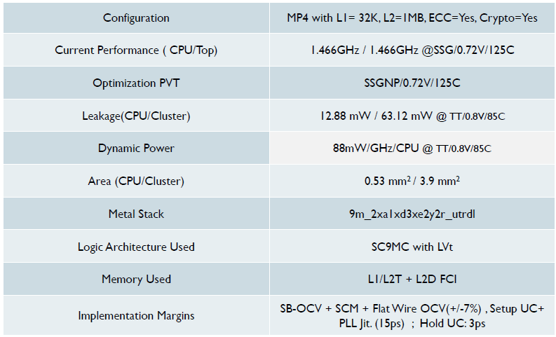 接下来看表格第一排,Configuration。这个最容易理解,使用了四核A53,一级数据缓存32KB,二级1MB,打开了ECC和加解密引擎。这几个选项会对面积产生较大影响,对频率和功耗也有较小影响。