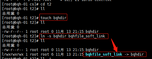 4) 执行命令:“ln –s 源文件 软连接文件”即可完成创建软连接(目标不能存在)