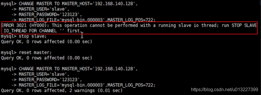 ERROR 3021(HY000): This operation cannot be performed with a running slave io thread; run STOP SLAVE IO_THREAD FOR CHANNEL ' ' first.