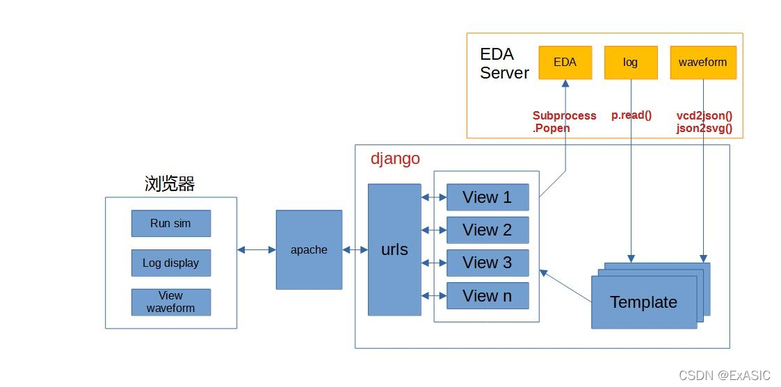 本文介绍了一种在浏览器里编辑代码、仿真、看log、看波形的方法。django介绍django是一个由python实现的web后端框架。这里“后端”就是指在服务器上执行的程序(前端程序在浏览器里执行)。django采用了 MVT 的软件设计模式,即模型(Model),视图(View)和模板(Template)。这种MVT的设计思想让数据与表现形式分开,从而编写的程序更容易理解和维护。django的结构大致如下图。简单地讲,浏览器提交的请求,经apache执行后,送给django。django先解析