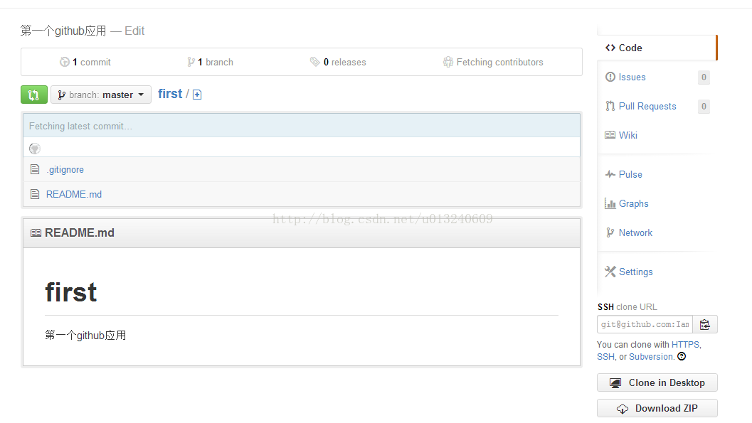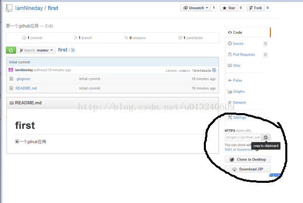 上述界面的uri对应于github上之前没有关闭的那个新建好的repository的界面(如下图)上的右下角,选择https并且点击图标将url复制到剪贴板,然后将该地址粘贴到上图的uri中