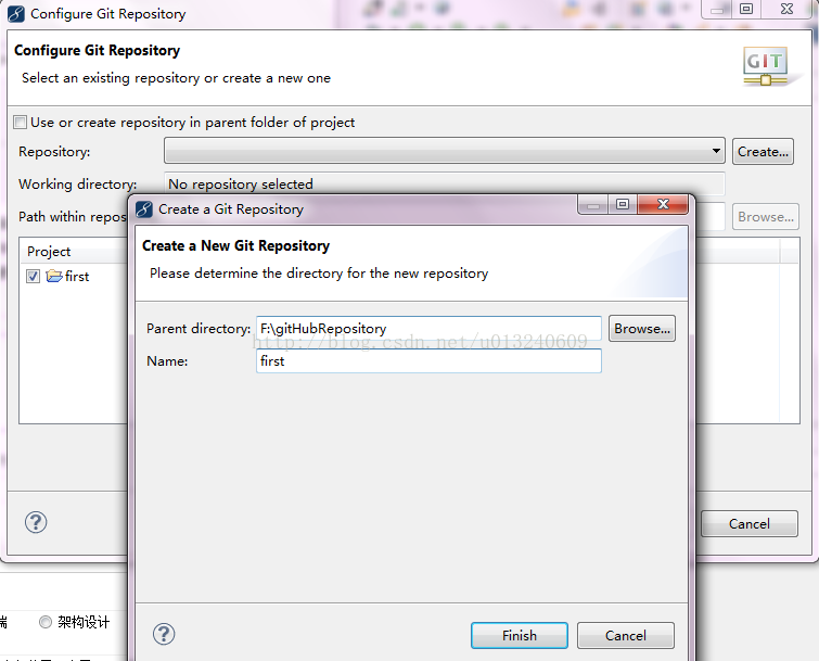 我的本地库的路径为F://gitHubRepository ;name就与项目名称一样叫first;点击finish以完成