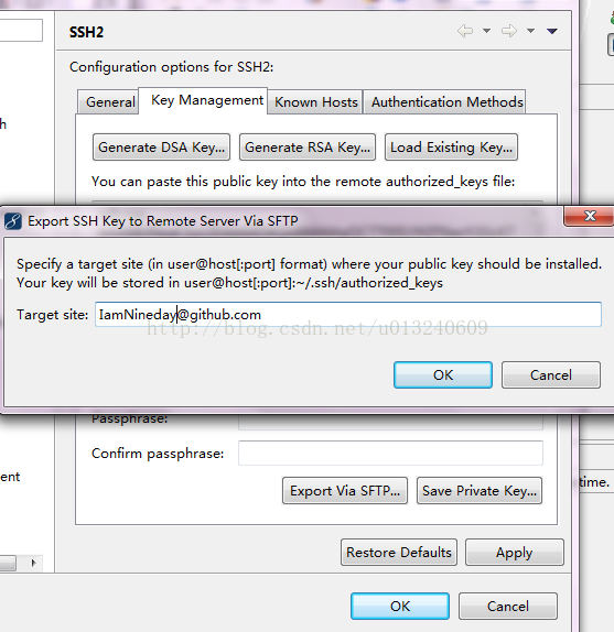 回到MyEclipse上,之前我们生成密钥的窗口,点击export via sftp 输入如下内容:
