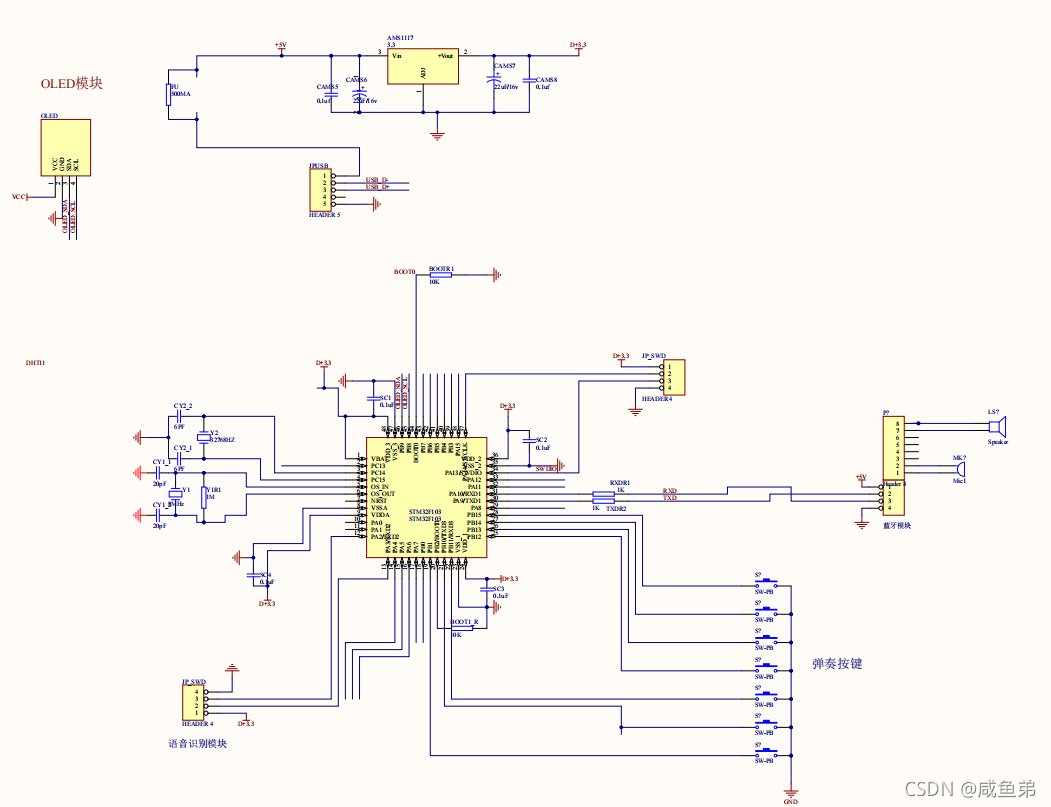 在设计中通过HC-06蓝牙模块实现了蓝牙通信功能、LD3320语音识别模块实现了语音控制功能、使用独立按键实现了模拟演奏功能同时使用OLED进行显示。......