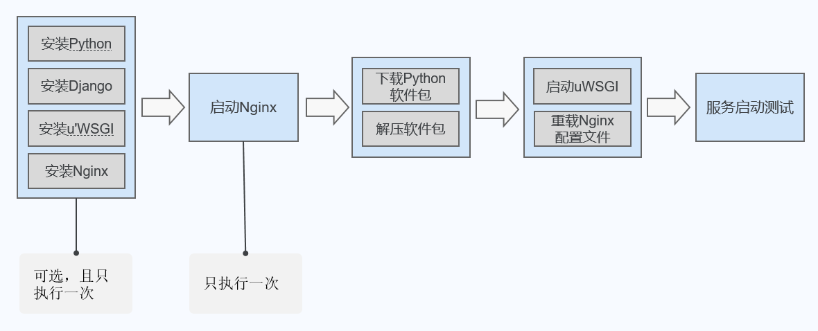 安装相关组件(可选,且只执行一次)->启动Nginx(只执行一次)->下载并解压django项目代码包 ->重新启动服务->服务启动测试