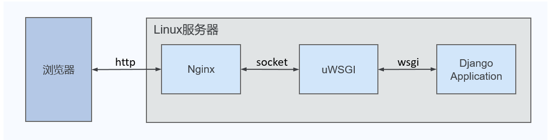 - uWSGI用于连接Web服务器(Nginx)和Python应用程序(Django Application)。