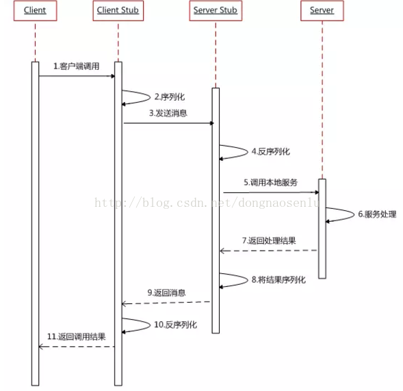 RPC采用客户机/服务器模式。请求程序就是一个客户机,而服务提供程序就是一个服务器。首先,客户机调用进程发送一个有进程参数的调用信息到服务进程,然后等待应答信息。在服务器端,进程保持睡眠状态直到调用信息到达为止。当一个调用信息到达,服务器获得进程参数,计算结果,发送答复信息,然后等待下一个调用信息,最后,客户端调用进程接收答复信息,获得进程结果,然后调用执行继续进行。