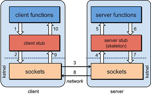 任何 RPC 客户机-服务器程序的重要实体都包括 IDL 文件(接口定义文件)、客户机 stub、服务器 stub 以及由客户机和服务器程序共用的头文件。客户机和服务器 stub 使用 RPC 运行时库通信。RPC 运行时库提供一套标准的运行时例程来支持 RPC 应用程序。