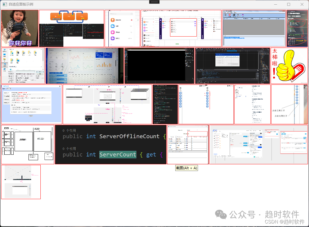 WPF开发一个可以自适应排列的Panel控件 初看标题可能无法理解,我们看看什么是自适应排列。乍一看它有点像WrapPanel控件,都是从左至右排列,如果一行排列不下就换行继续排列,但是细看你就会发现不对,WrapPanel控件行尾是不会对齐的,也就是说只要WrapPanel的子控件的宽度不一致,每一行的末尾就会必定留下一段空白,而这个控件每一行末尾都是对齐的,这就让人很疑惑了,既然每个子控件的宽度不一样,怎么可能每一行的子控件宽度都正好?