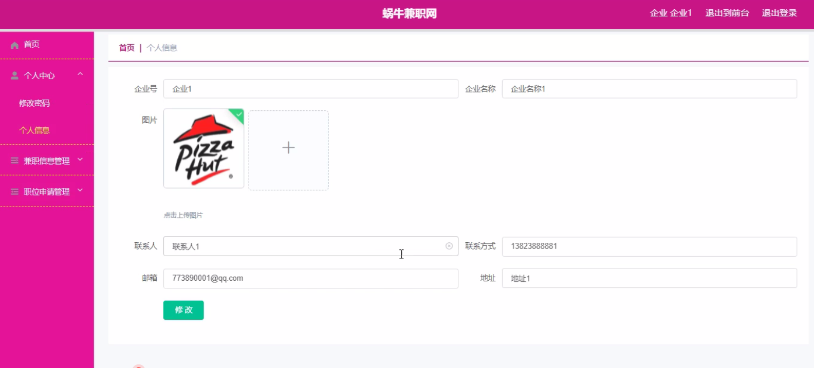 个人信息,在个人信息页面中通过填写企业号、企业名称、图片、联系人、联系方式、邮箱、地址等信息还可以根据需要对个人信息进行修改,如图5-16所示。
