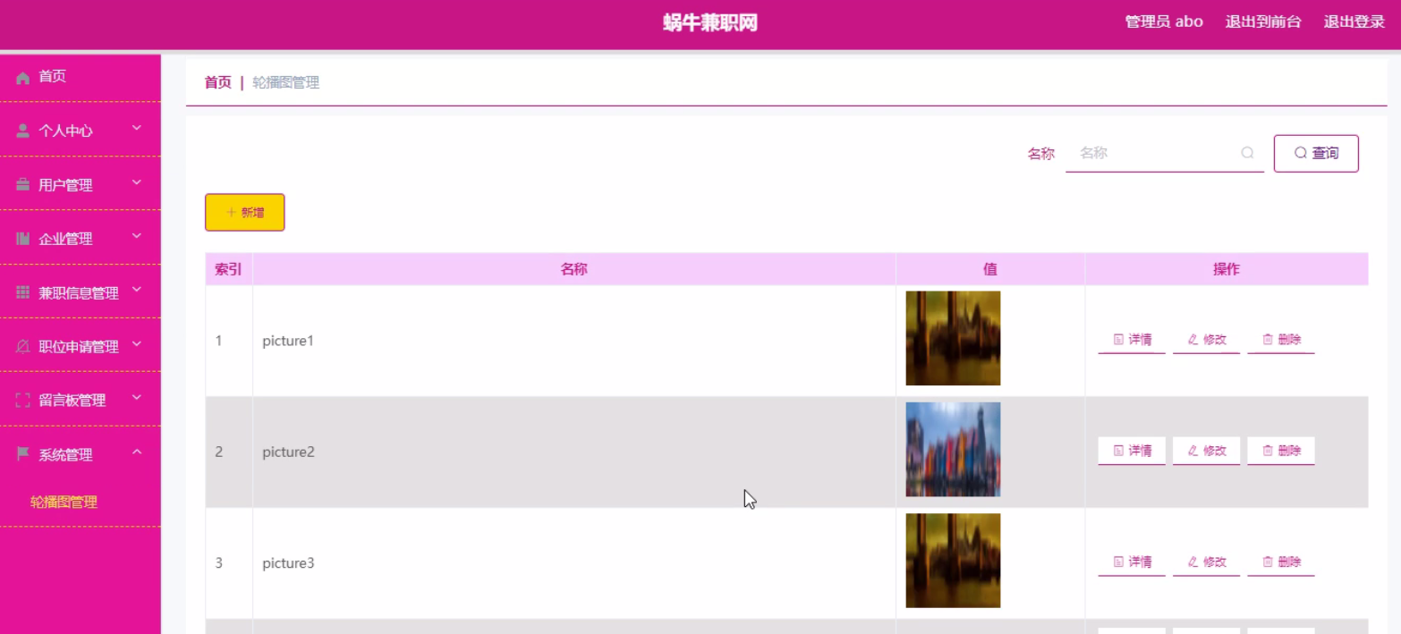 轮播图;该页面为轮播图管理界面。管理员可以在此页面进行首页轮播图的管理,通过新建操作可在轮播图中加入新的图片,还可以对以上传的图片进行修改操作,以及图片的删除操作,如图5-7所示。