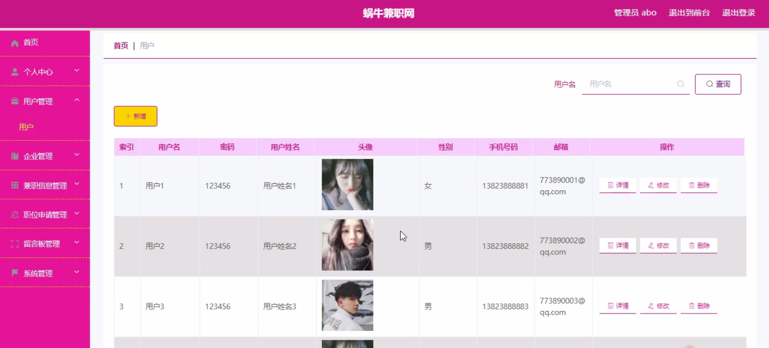 用户管理,在用户管理页面中可以通过填写用户名、密码、用户姓名、头像、性别、手机号码、邮箱等信息进行详情、修改、删除等操作,如图5-2所示。还可以根据需要对企业管理进行详情、修改或删除等详细操作,如图5-3所示。