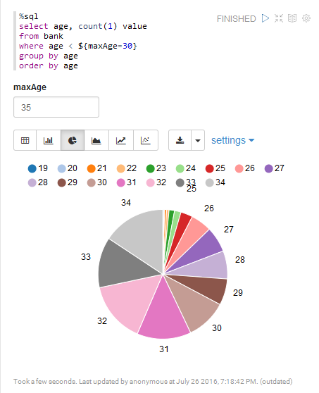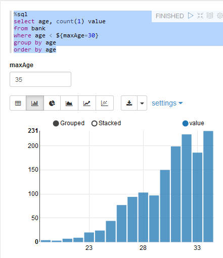 数据可视化 指令、代码提交后Zeppelin返回结果给用户,如果是结构化的数据,Zeppelin提供可视化机制,通过各类图表展示数据,十分方便。