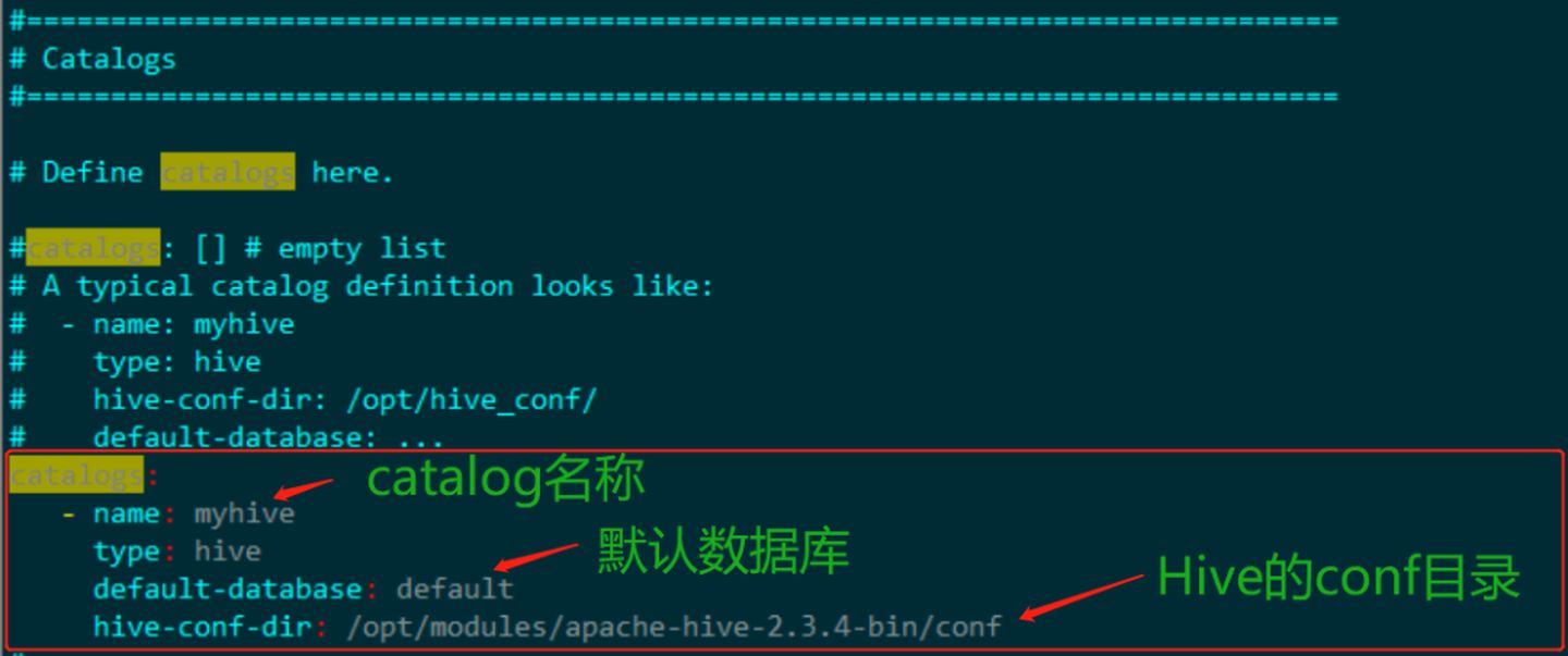 该文件时Flink SQL Cli启动时使用的配置文件,该文件位于Flink安装目录的conf/文件夹下,具体的配置如下,主要是配置catalog: