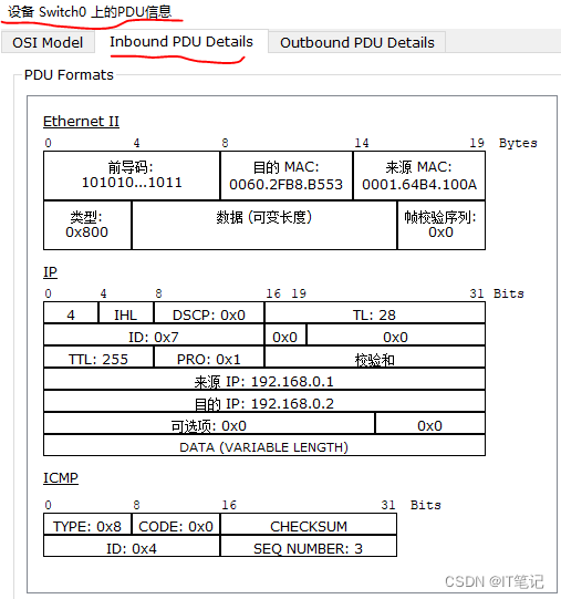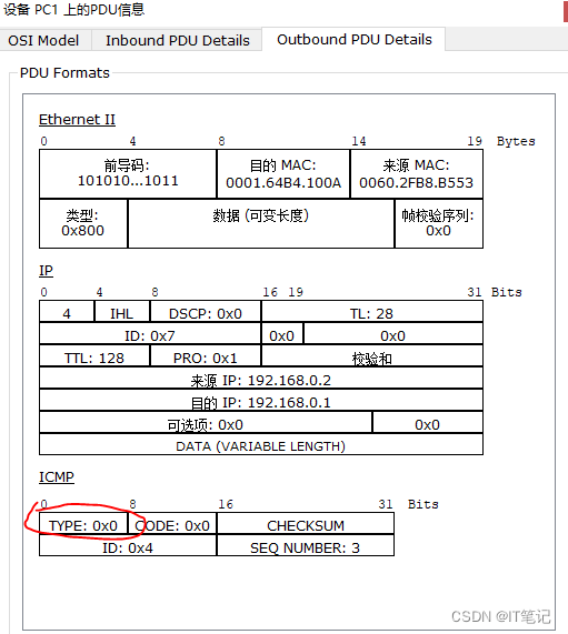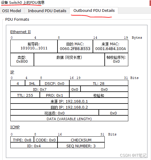 (1)PC0发ICMP包,出站PDU详细数据(outbound PDU Details)