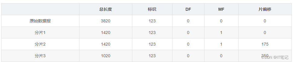 例如:一数据报的总长度为3820字节,数据部分为3800字节(IP首部为固定20字节),需要分片传输。假设每片IP报文长度不超过1420字节。去掉固定首部长度20字节,每片报文数据部分长度不超过1400。于是分成3个数据报片,其数据部分长度分别为1400、1400、1000字节。原始数据报首部被复制为各数据报片的首部,只需要改变有关字段的值。
