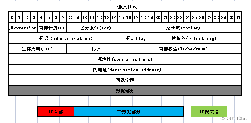 首部长度(网际报文头长度IHL):占4位,可表示的最大十进制数值是15。首部长度字段所表示的单位是32位(4字节,与TCP首部中长度字段单位一致)。因为IP首部的固定长度是20字节,因此首部长度字段的最小值为5(0101)。当首部长度为15(1111)时,表示的长度为60字节当IP分组的首部长度不是4的整数倍时,必须利用最后的填充字段加以填充达到4的整数倍。