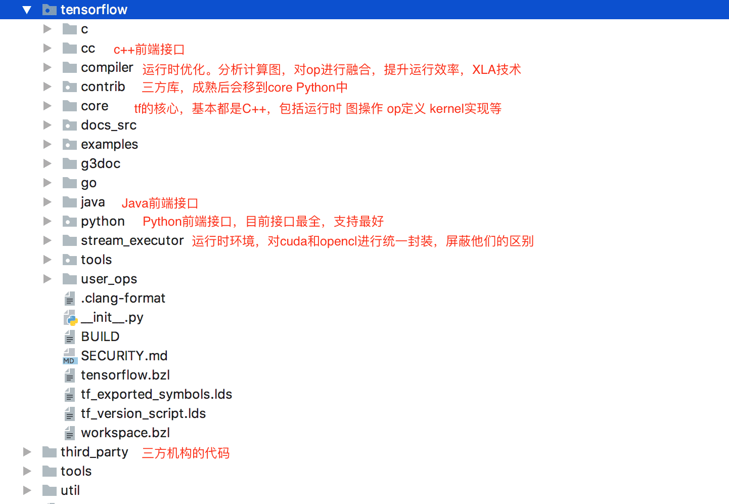 TensorFlow源码基本也是按照框架分层来组织文件的。如下