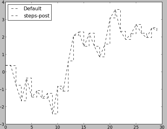 - In [21]: plt.plot(data, 'k--', drawstyle='steps-post', label='steps-post')