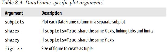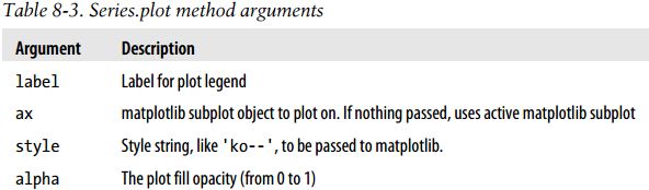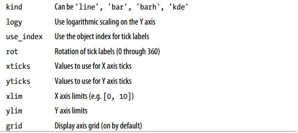 该Series对象的索引会被传给matplotlib,并用以绘制X轴。可以通过use_index=False禁用该功能。X轴的刻度和界限可以通过xticks和xlim选项进行调节,Y轴就用yticks和ylim。plot参数的完整列表如下所示: