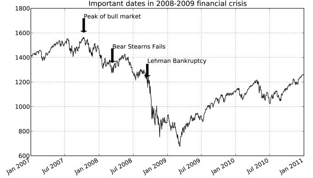 注解中可以既含有文本也含有箭头。例如,我们根据2007年以来的标准普尔500指数收盘价格(来自Yahoo! Finance)绘制一张曲线图,并标出2008年到2009年金融危机期间的一些重要日期。如下所示: