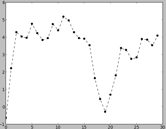 - In [19]: plot(randn(30).cumsum(), color='k', linestyle='dashed', marker='o')