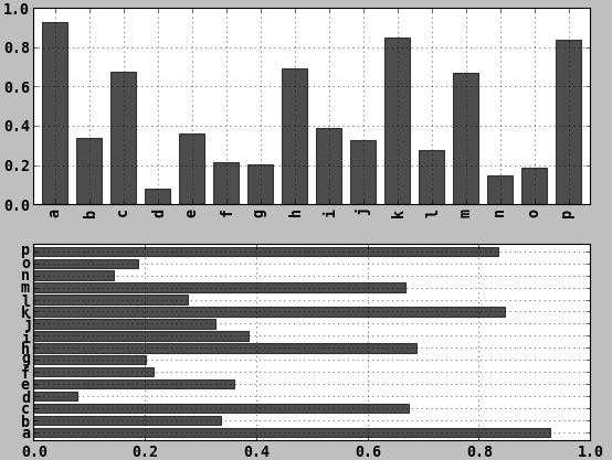 - In [57]: data.plot(kind='bar', ax=axes[0], color='k', alpha=0.7)