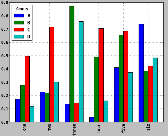 - In [60]: df = pd.DataFrame(np.random.rand(6, 4), index=['one', 'two', 'three', 'four', 'five', 'six'], columns=pd.Index(['A', 'B', 'C', 'D'], name='Genus'))