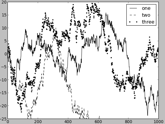 - In [38]: ax.plot(randn(1000).cumsum(), 'k.', label='three')