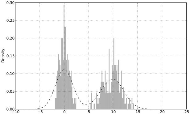 - In [75]: comp2 = np.random.normal(10, 2, size=200) # N(10, 4)