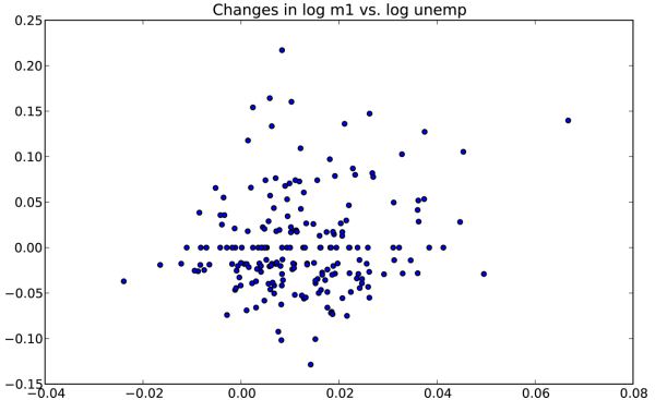 - In [84]: plt.title('Changes in log %s vs. log %s' % ('m1', 'unemp'))