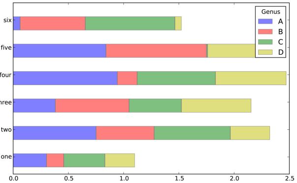 DataFrame各列的名称“Genus”被用作了图例的标题。设置stacked=True即可为DataFrame生成堆积柱状图,这样每行的值就会被堆积在一起,如下所示: