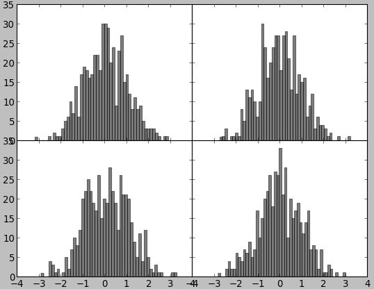 - In [9]: _ = ax1.hist(randn(100), bins=20, color='k', alpha=0.3)