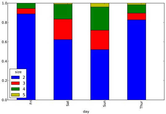 以小费数据集为例,假设我们想要做一张堆积柱状图以展示每天各种聚会规模的数据点的百分比。我用read_csv将数据加载进来,然后根据日期和聚会规模创建一张交叉表: