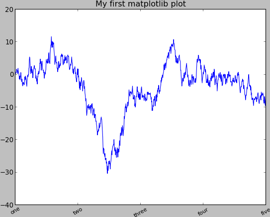 - In [32]: labels = ax.set_xticklabels(['one', 'two', 'three', 'four', 'five'], rotation=30, fontsize='small')