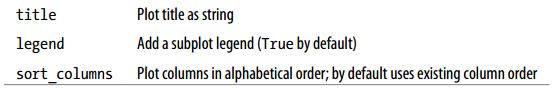 DataFrame还有一些用于对列进行灵活处理的选项,例如,是要将所有列都绘制到一个subplot中还是创建各自的subplot,详细信息如下所示: