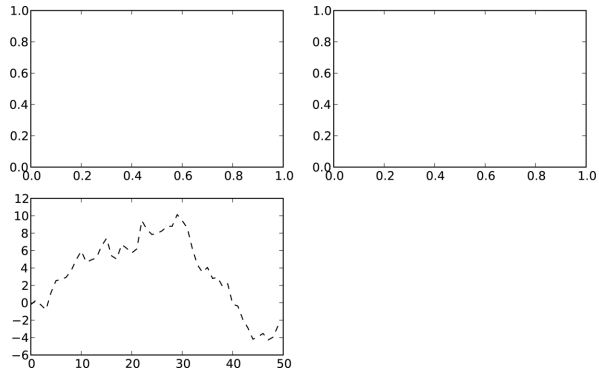“k--”是一个线型选项,用于告诉matplotlib绘制黑色虚线图。上面那些由fig.add_subplot所返回的对象是AxesSubplot对象,直接调用它们的实例方法就可以在其他空着的格子里面画图了,如下所示: