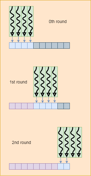 Beware the behavior of the accessing : While thread 0 accesses the location [0], thread 1 would access the location [1], thread 2 would access the location [2]..etc. And the location[1] would be accesses by thread 0 and 1; the location[2] would accesses by thread 0, 1, 2.. the accessing is localized.